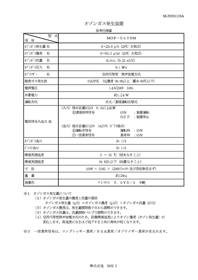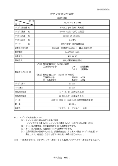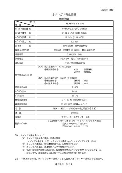 | 食品工場向けオゾン水殺菌設備 各種 | 5g/h~50g/h オゾンガス発生装置+マイクロバブルによる、オゾンミキシング装置+排オゾン処理装置 |