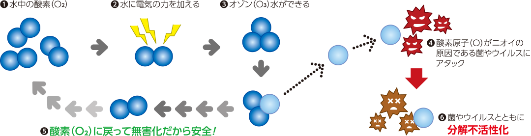 薬剤は使用後の残留性が高く、環境汚染の原因になる危険をはらんでいますが、電解オゾン水は下水に流しても環境汚染の原因になりません。